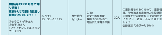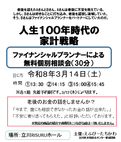 えふぴーたちかわは、とくに女性の長寿に対する老後資金についてのセミナーを開催しています。